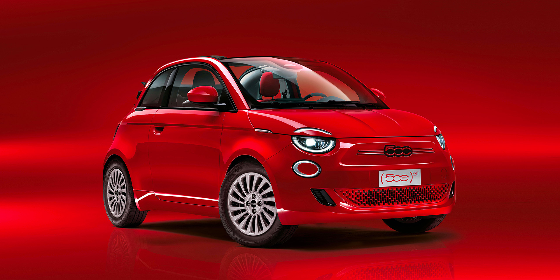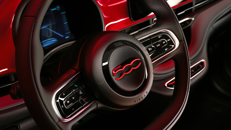 Guidez votre vie avec style grâce au volant gainé de noir avec le logo (500e)RED peint et au tableau de bord rouge.