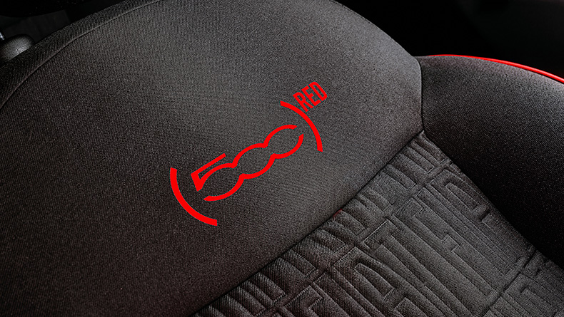 Vous vous sentirez à l'aise dans les sièges FIAT Monogram en tissu recyclé noir avec des coutures rouges et le logo (RED).